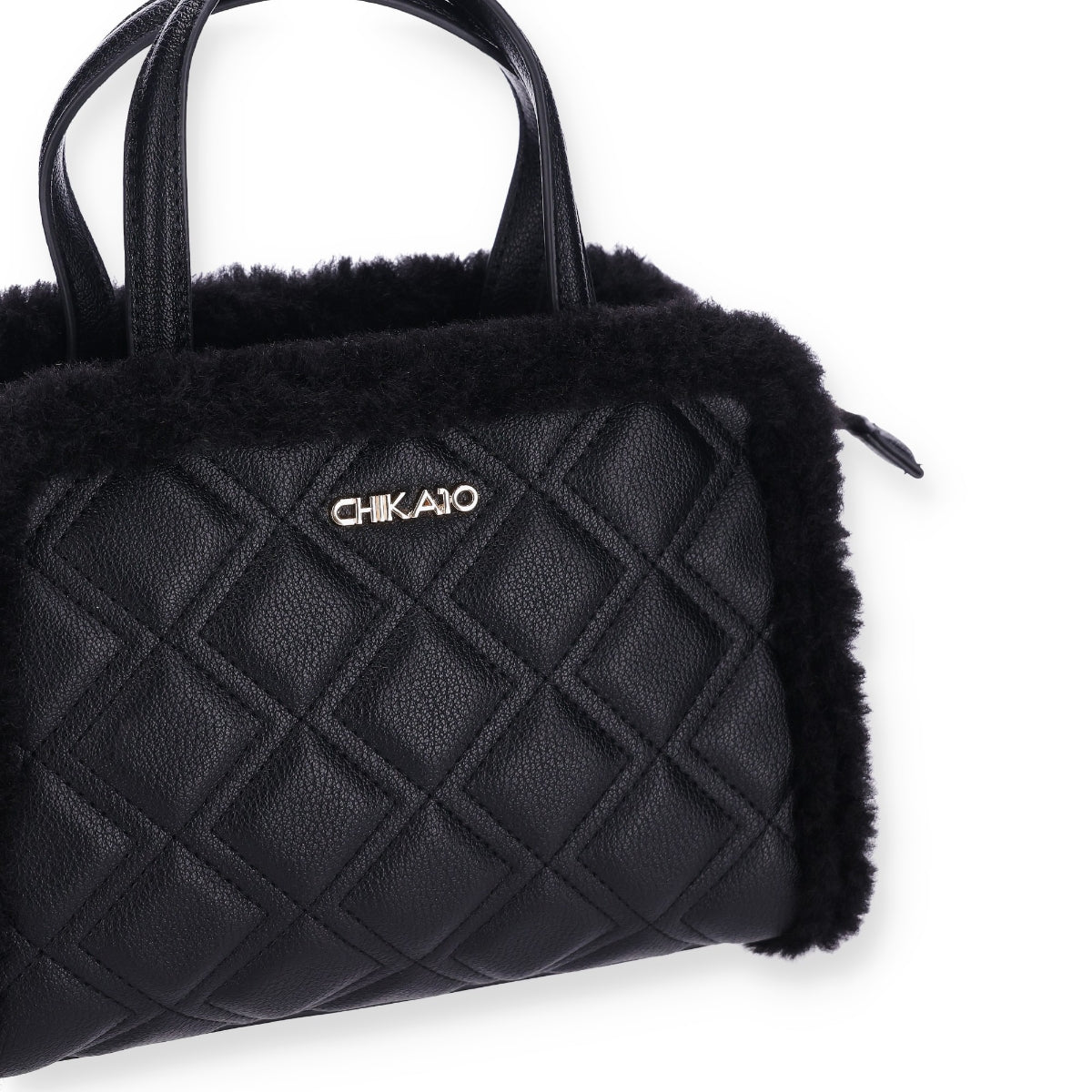 Bolso de Mano con Estilo Sofisticado: Este bolso presenta un diseño acolchado con detalles de pelo en los laterales. Tiene dos asas cortas y una correa ajustable, ambas sujetas con herrajes metálicos. Perfecto para complementar un look elegante y versátil.
