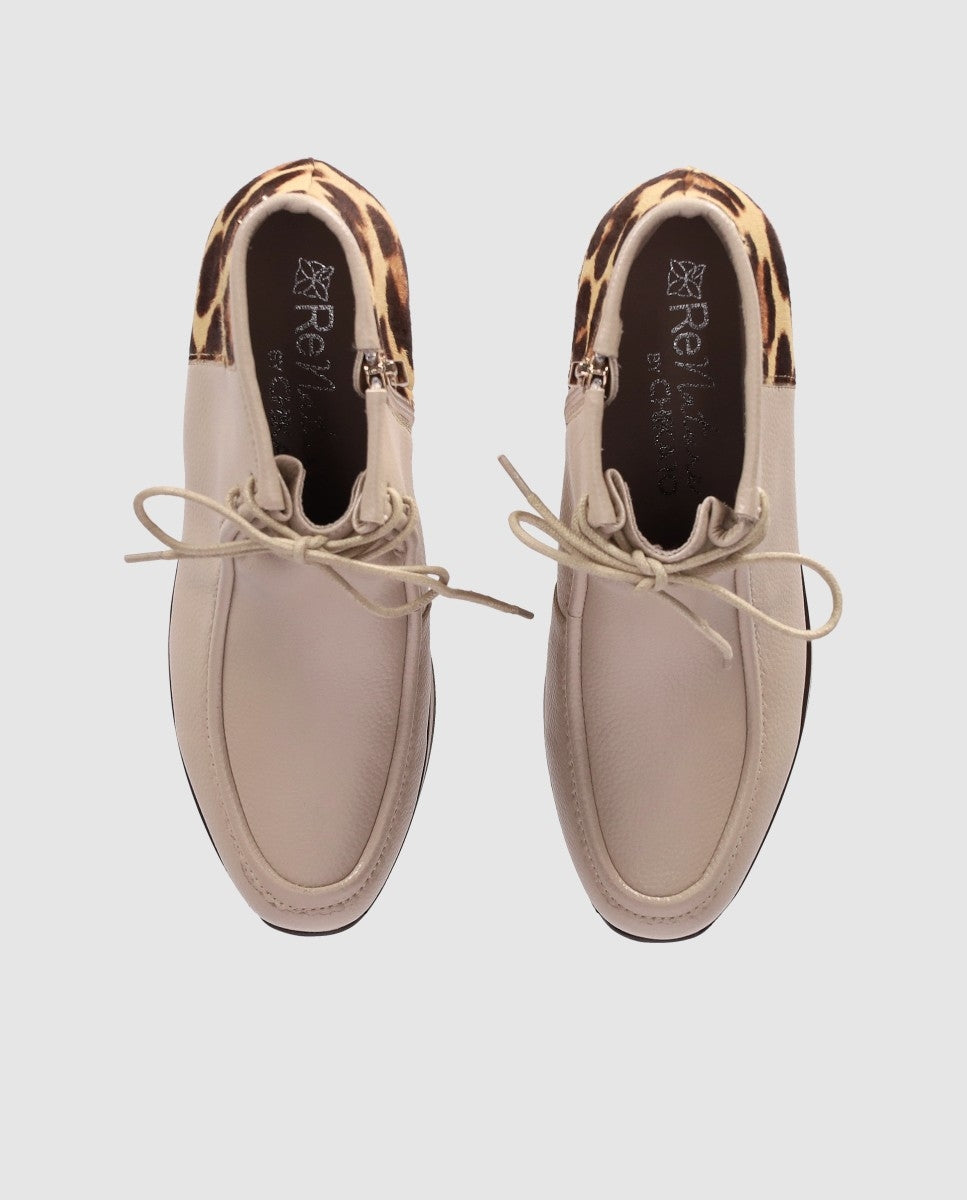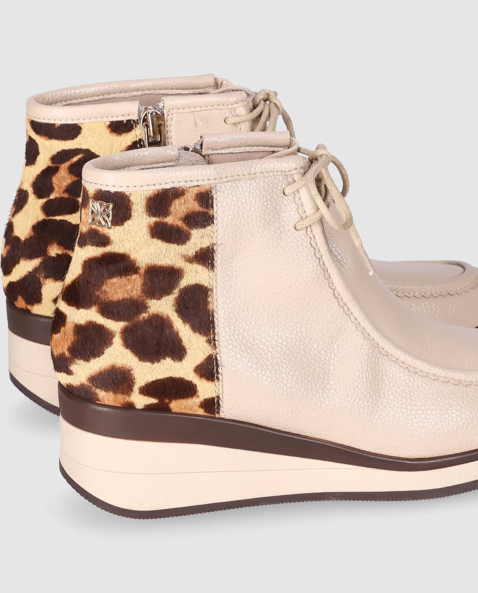 Botín con cuña y panel estampado: Este elegante botín de cuña ofrece una combinación única de estilo. Su diseño presenta un panel animal print en la parte trasera que añade un toque distintivo. La suela bicolor proporciona estabilidad y su cremallera lateral, un calce práctico. ¡Perfecto para un look moderno y atrevido!