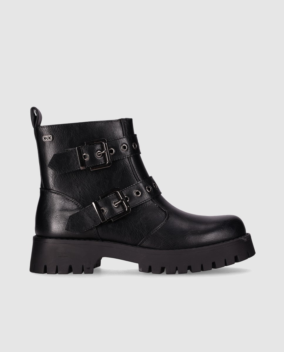 Botín con hebillas y suela robusta: Este botín combina moda y funcionalidad con su diseño en cuero vegano y dos hebillas decorativas. La suela robusta con dibujo profundo garantiza un excelente agarre y durabilidad. ¡Con estos botines, cada paso será un desfile de estilo!