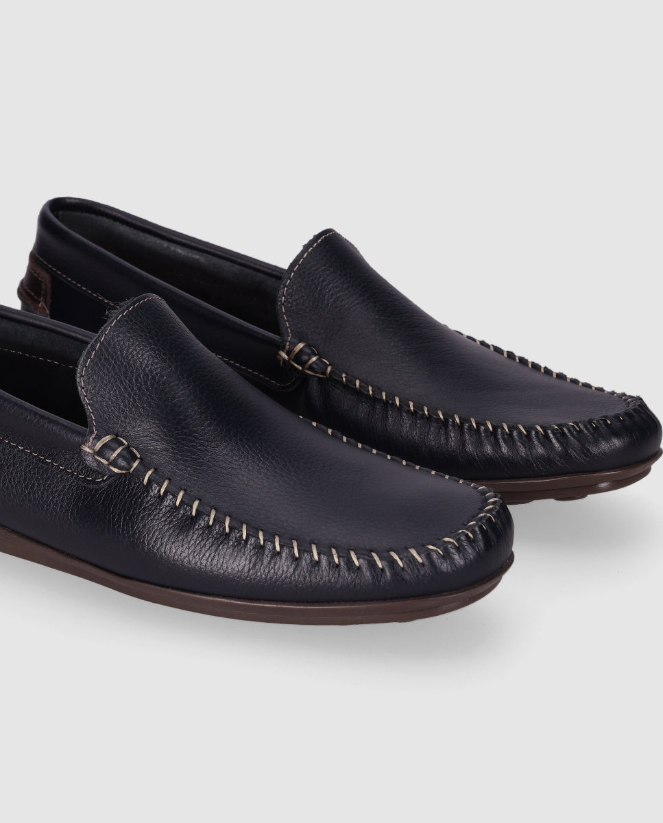 Mocasín de cuero con diseño de costura: Este mocasín de cuero presenta un diseño clásico de costura visible alrededor de la punta y los laterales. La suela de goma ofrece buena tracción y durabilidad, mientras que el interior es cómodo para el uso diario. Perfecto para un look casual y semi-formal.