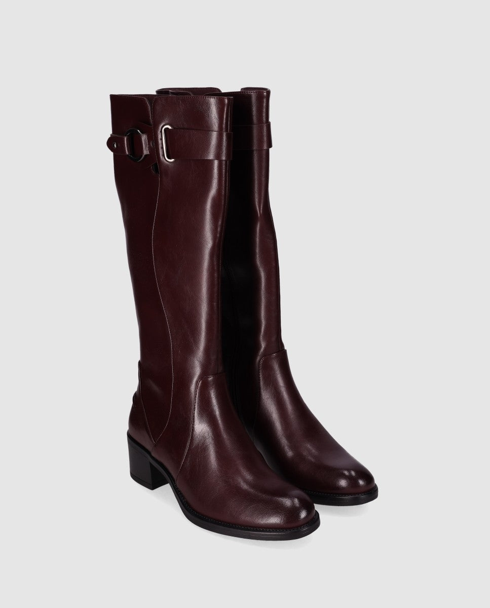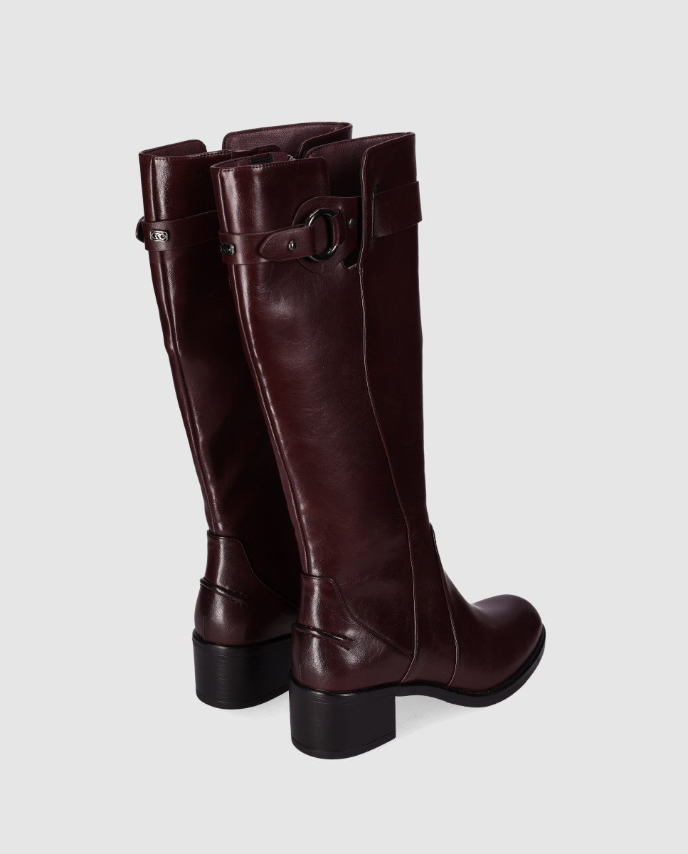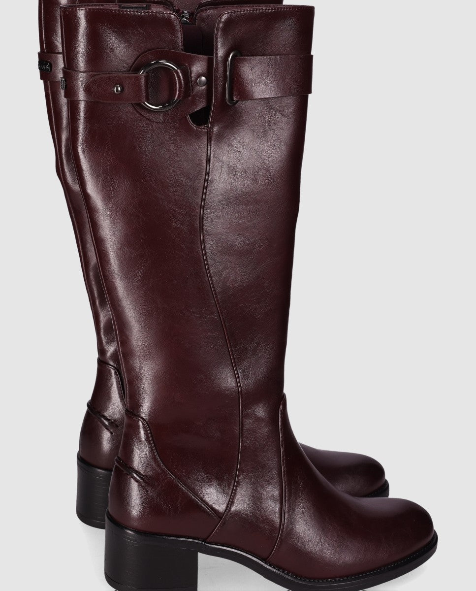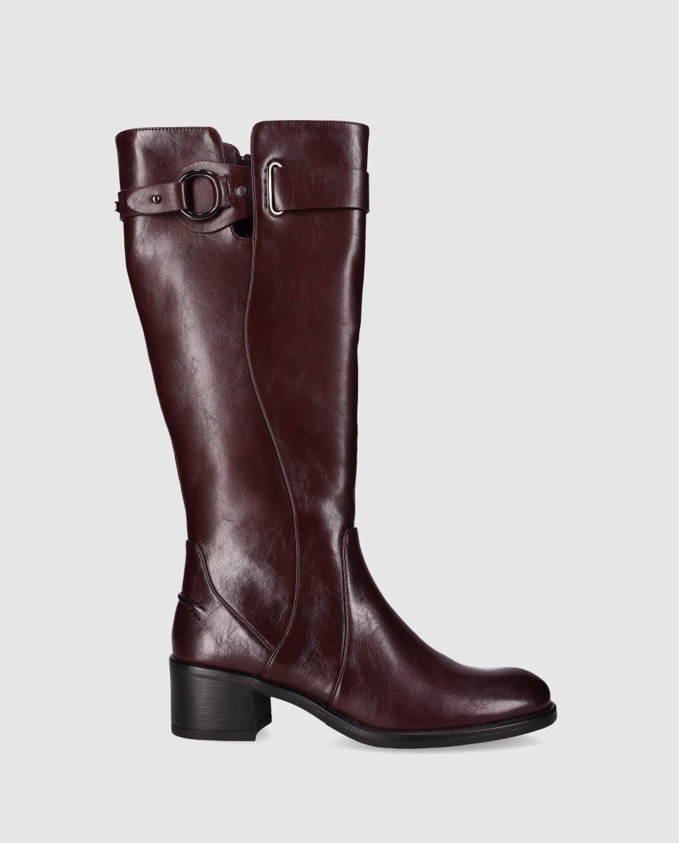 Botas de tacón medio con hebilla decorativa. Con caña alta, presentan un elegante acabado en piel vegana suave y un detalle de hebilla decorativa en su caña. Su cierre en cremallera lateral y su diseño sofisticado las hace perfectas para ocasiones casuales y looks formales. ¡Combina elegancia y confort en cada paso!