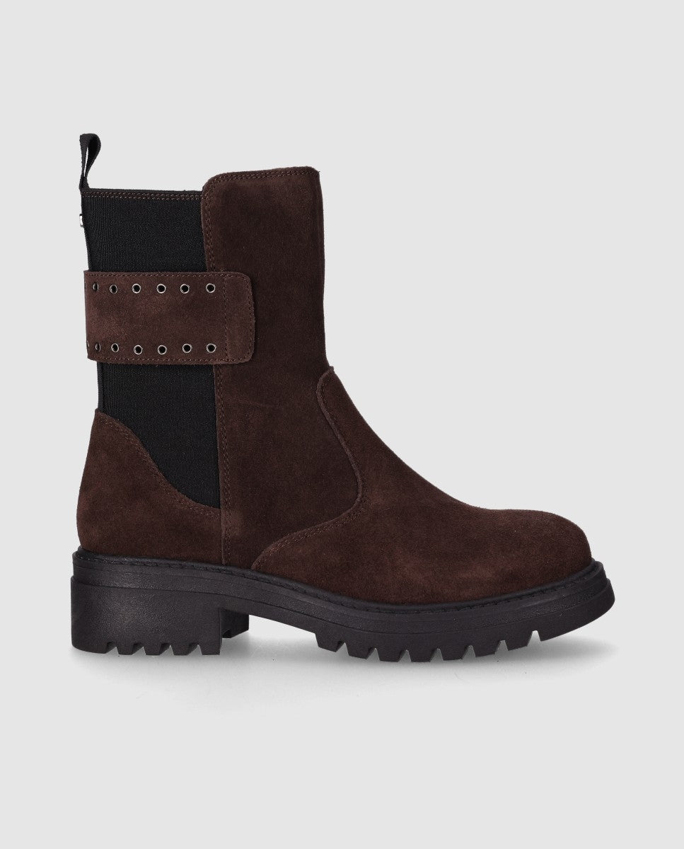 Botín de piel vuelta con panel elástico y suela robusta. Botín de piel vuelta con panel elástico lateral y correa decorativa con ojales metálicos en su caña. Con suela tipo truck y estilo chunky, será una combinación perfecta de estilo y comodidad.
