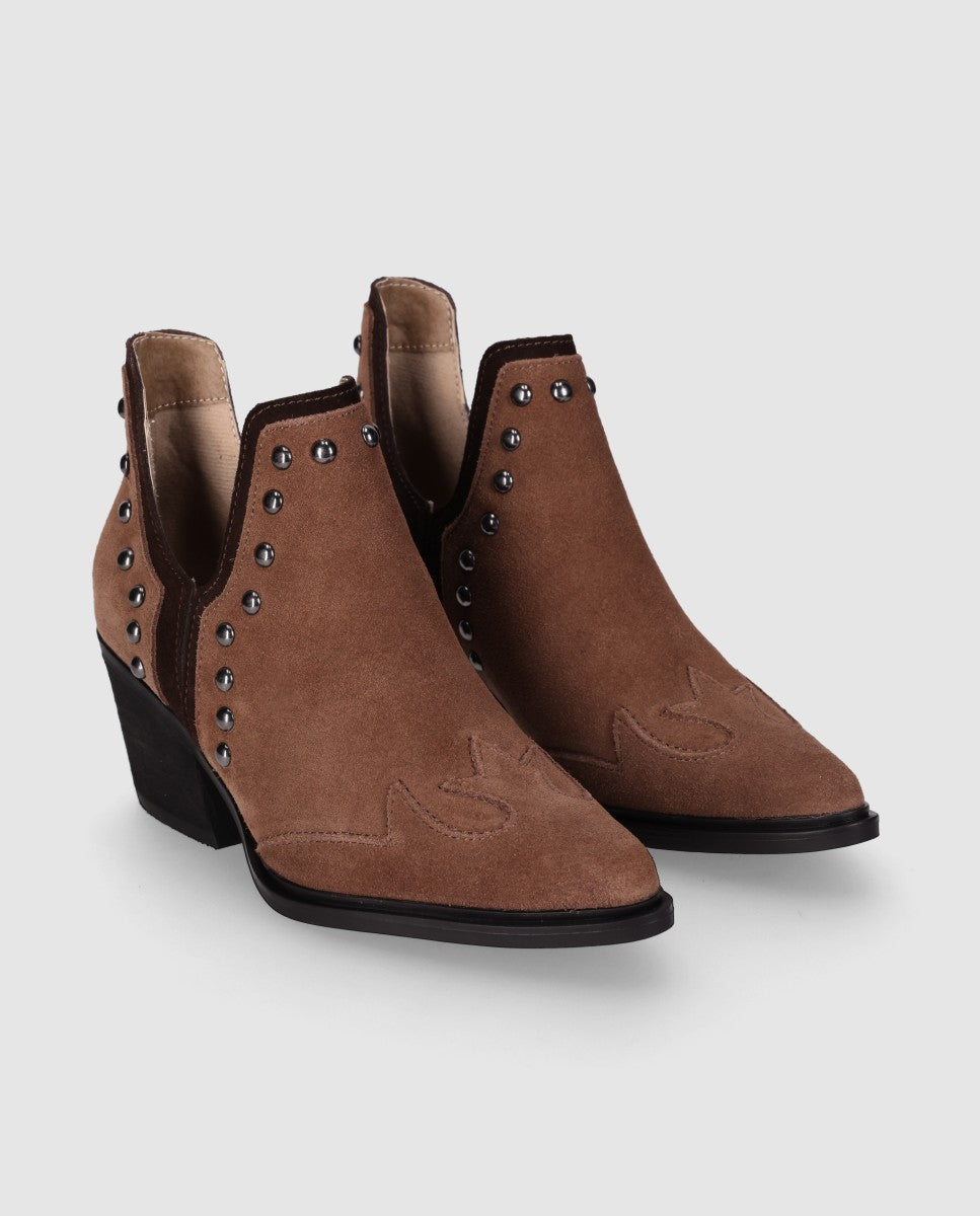 Botín de Gamuza con Tacón Bajo y Detalles Metálicos: Botín estilo campero con tacón bajo y detalles metálicos decorativos en los laterales. Su diseño moderno y estilizado lo hace perfecto para los entusiastas de la moda que buscan opciones de calzado a la última, ¡Marca tendencia con cada paso!