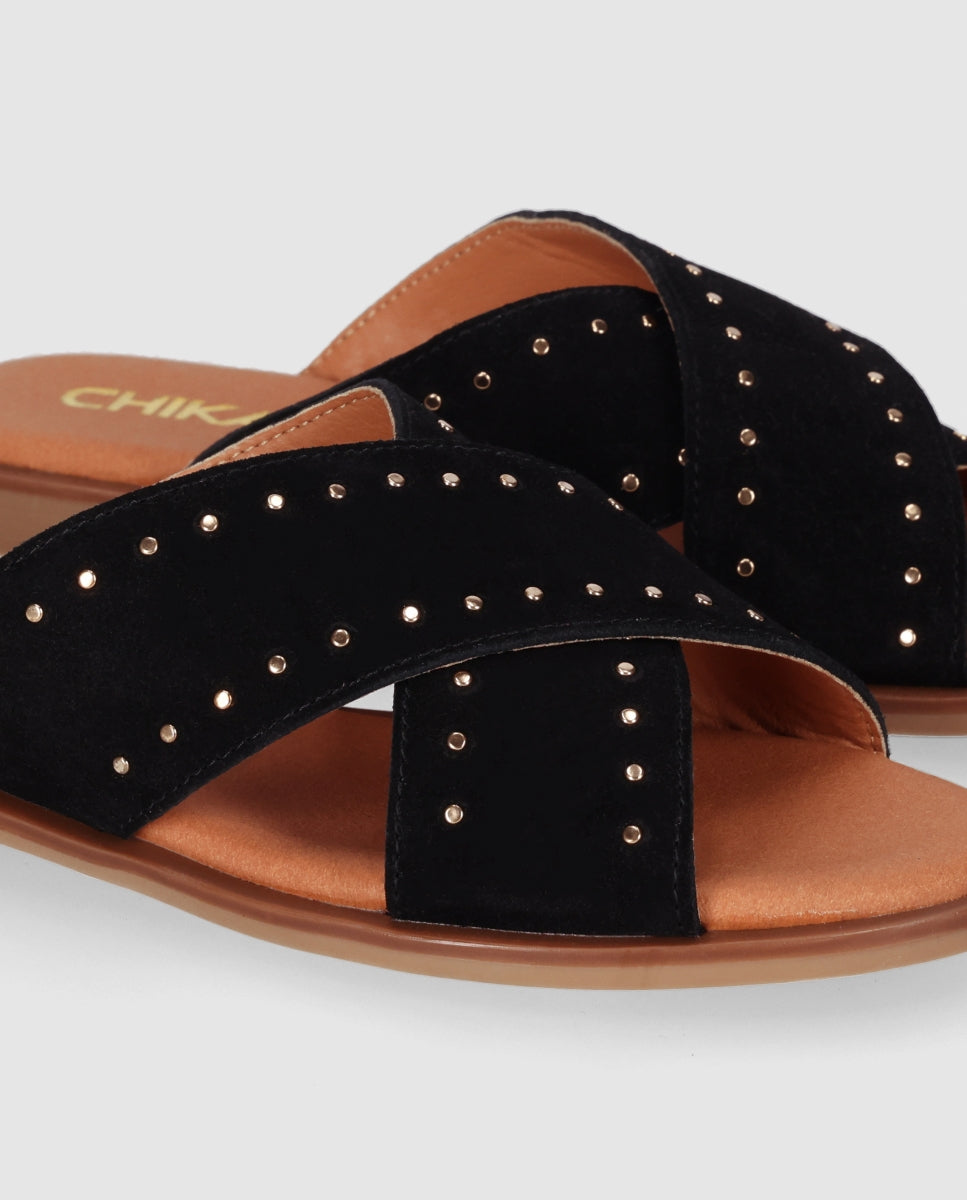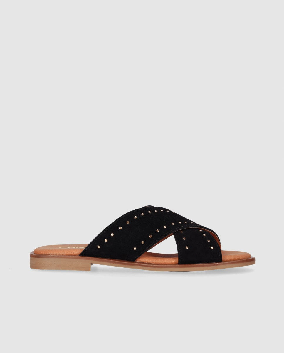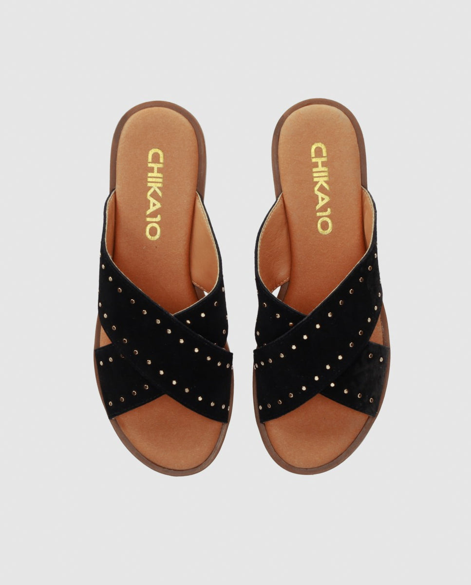 Sandalia plana de piel tipo serraje con tiras anchas cruzadas que sujetan el pie con suavidad. La planta acolchada y la suela ligera la convierten en un básico cómodo para el día a día. Póntelas y descubre que el verdadero lujo es que tus pies se olviden de que las llevas.