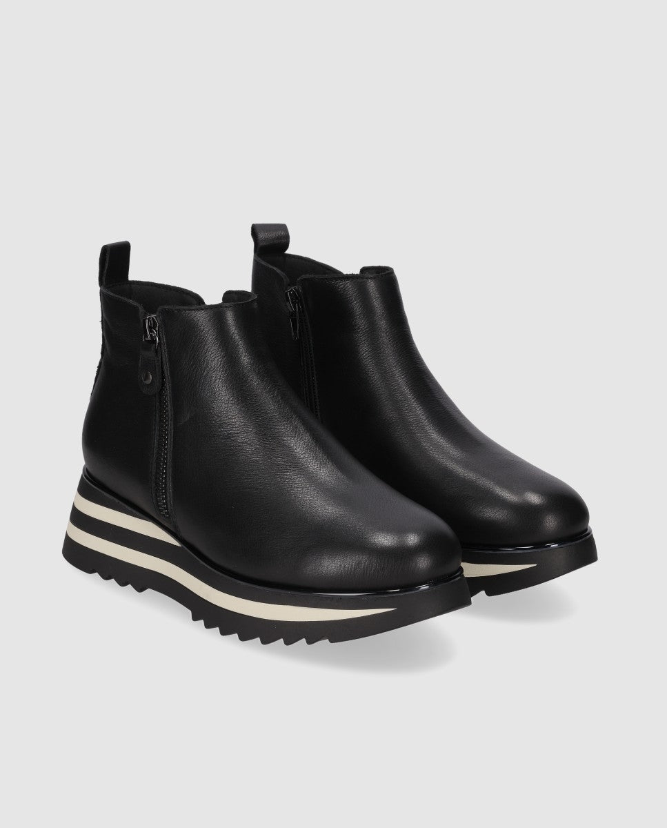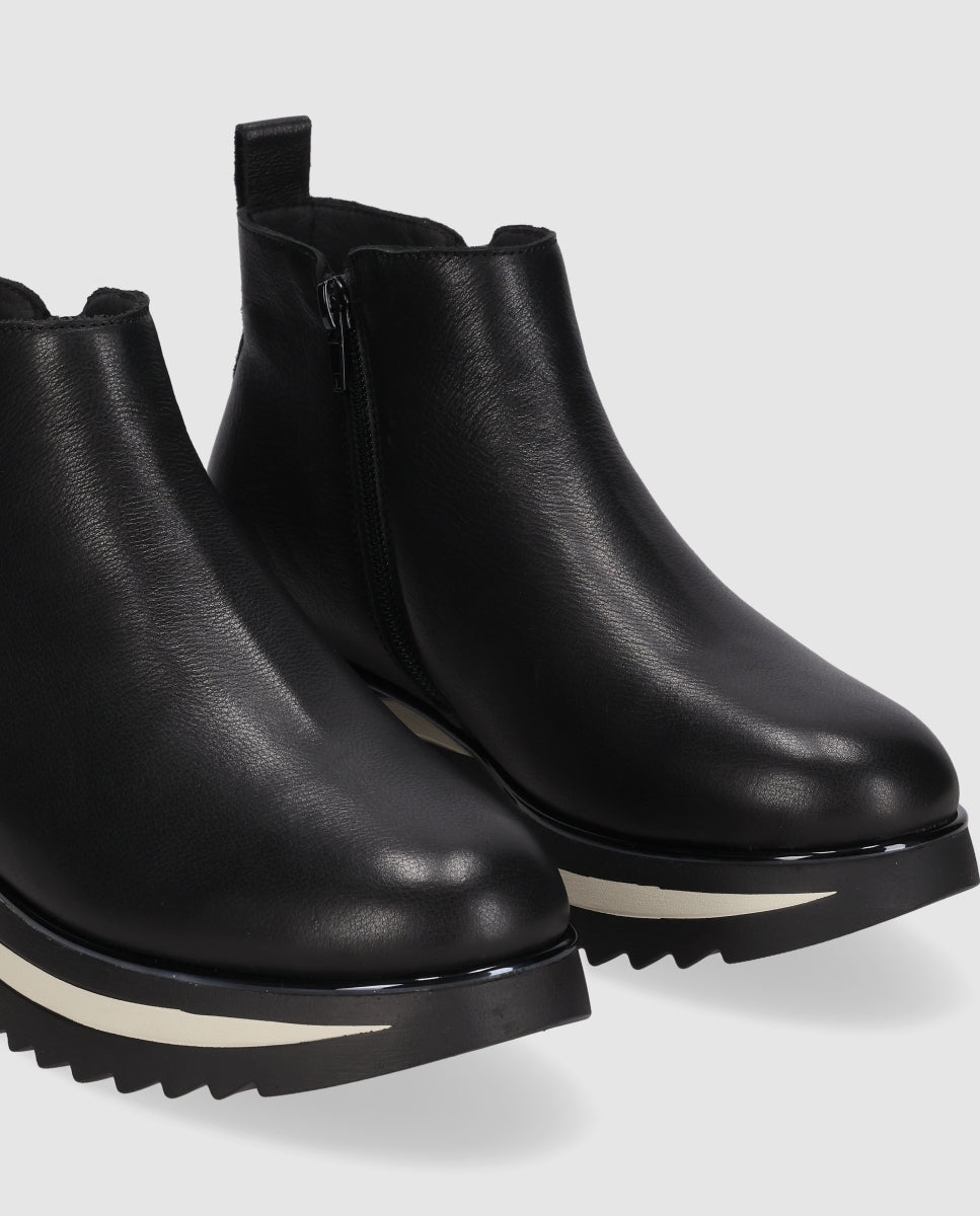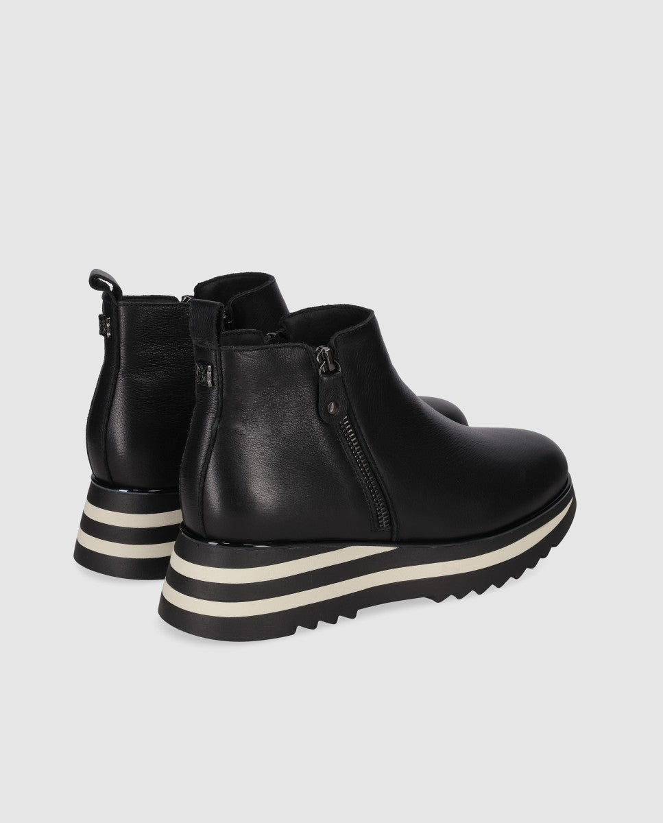 Botin de cuero con suela bicolor: Su cuña baja con patrones de líneas bicolor aporta un distintivo toque de sofisticación y extra de confort. El cierre en cremallera y su textura efecto piel pulida aporta el toque chic a este básico. ¡Perfectas para marcar tendencia sin dejar de lado la comodidad!