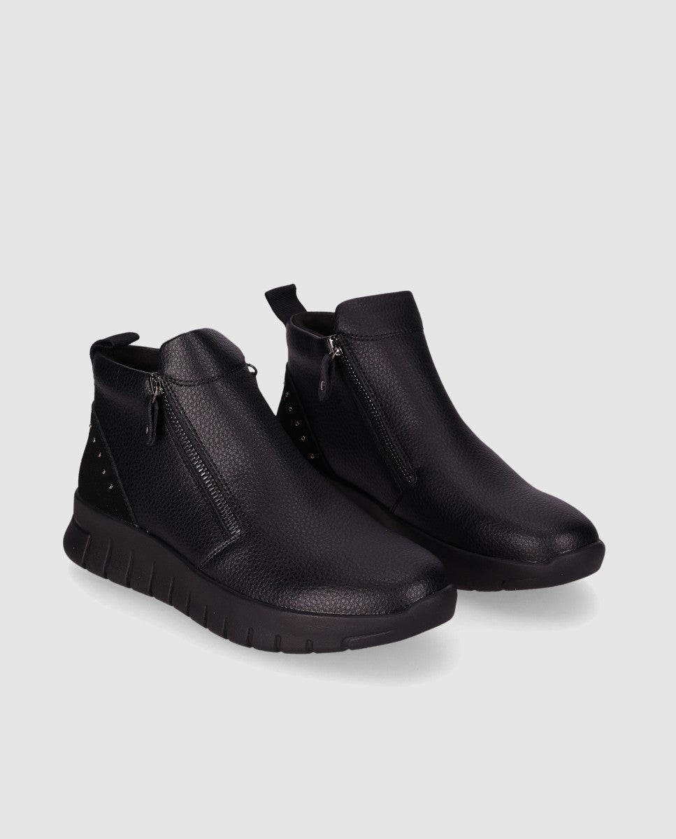 Botín con suela plana y cierre de cremallera. Con estilo deportivo cuenta con un diseño superior de cuero texturizado y una suela gruesa y acolchada para mayor comodidad. Su cierre de cremallera y detalles metalizados en forma de tacha, le da un atractivo distinto y moderno. ¡Tu complemento ideal en cualquier ocasión!