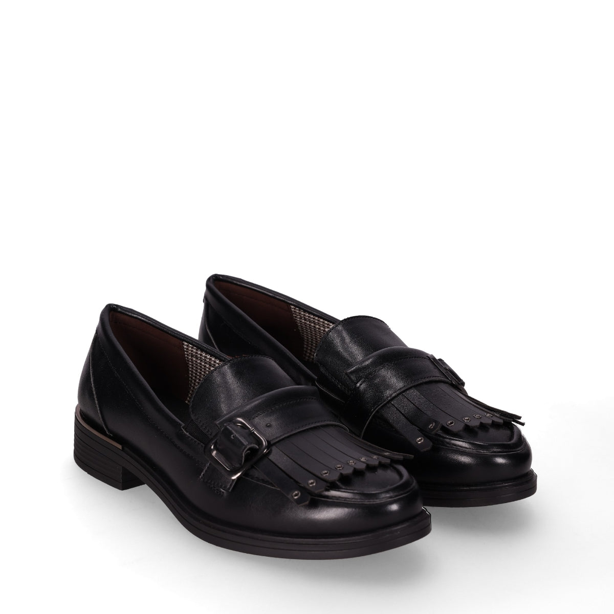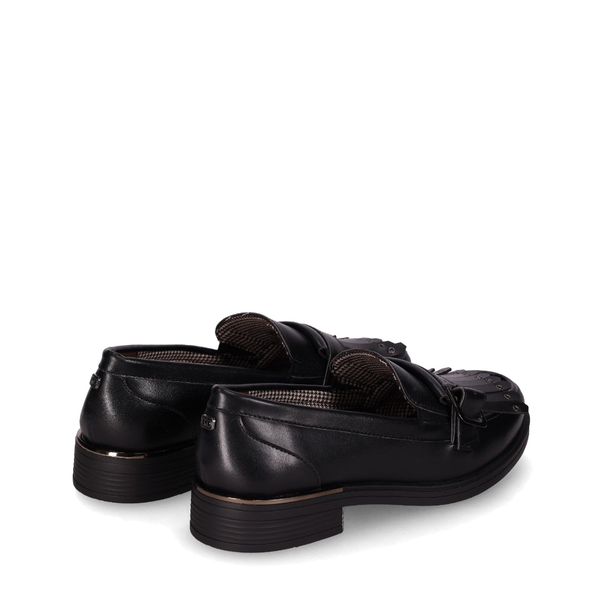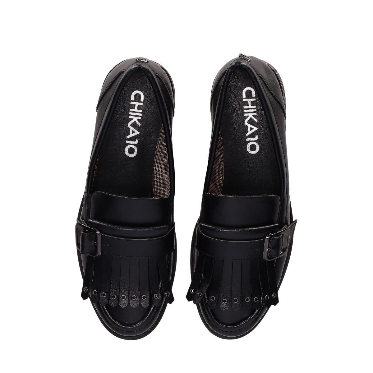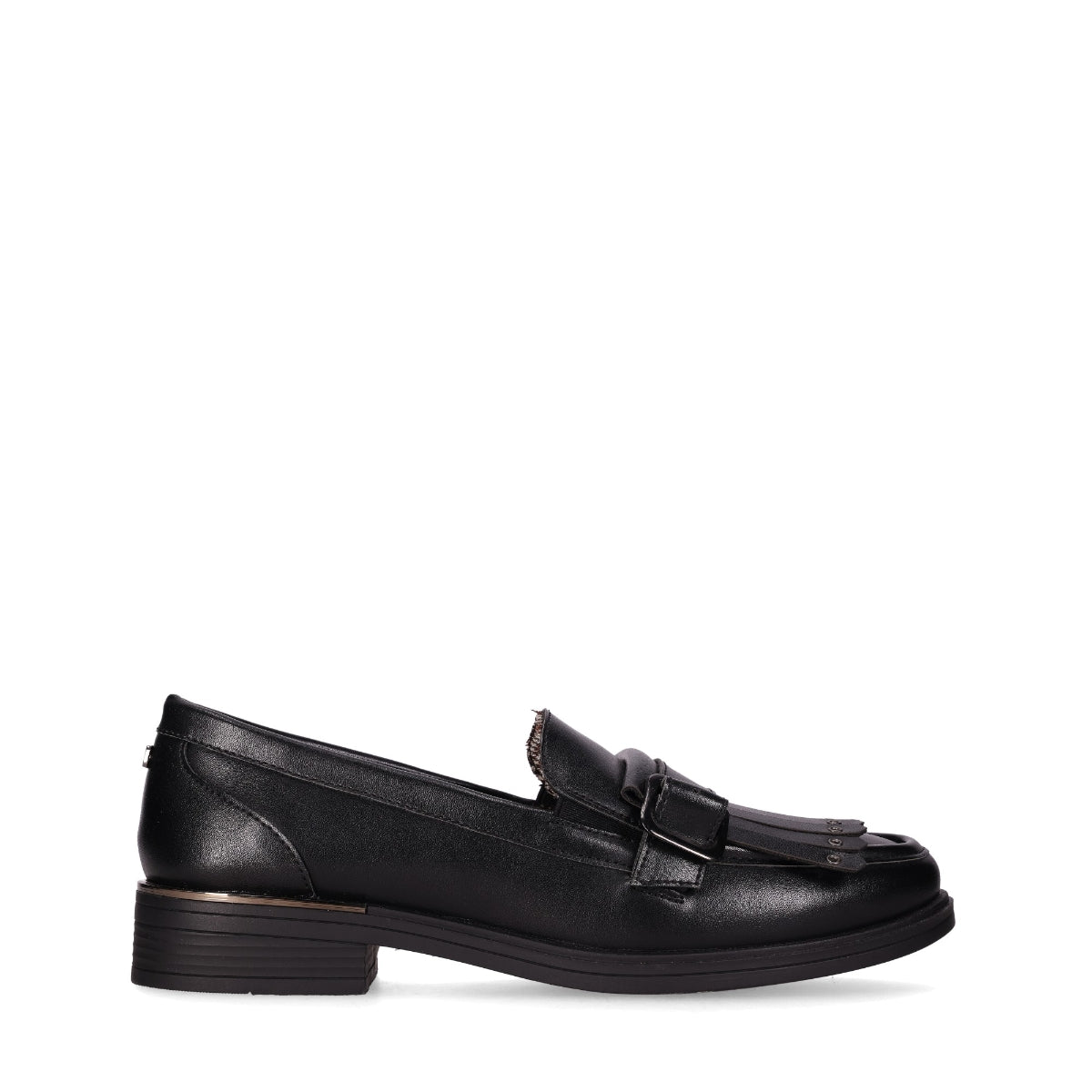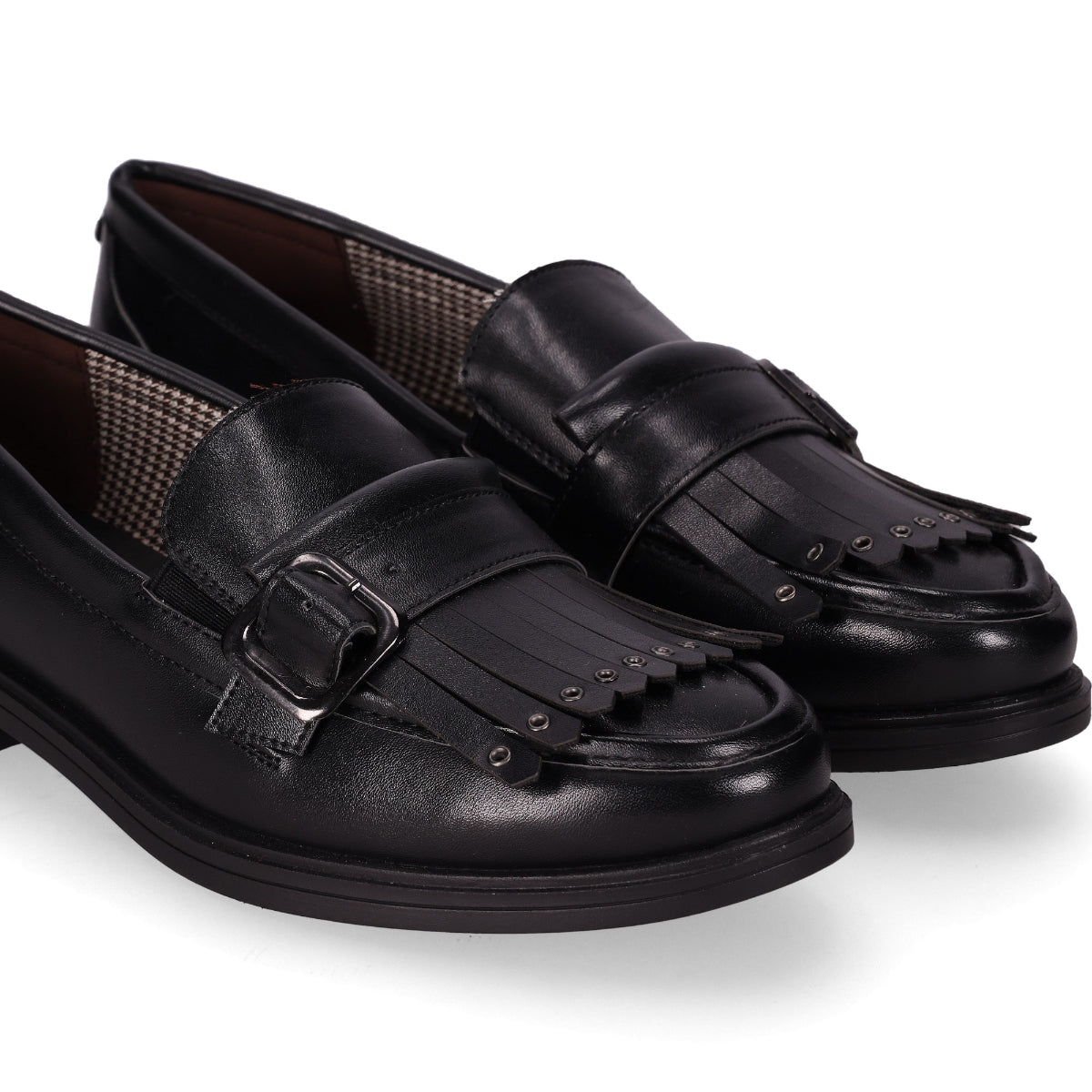 Mocasines de hebilla y flecos decorativos. Con un diseño elegante en piel vegana, el rediseño del clásico mocasín plano le dará el toque de atención necesario a tu look. El ligero acento metálico y sus aplicaciones decorativas, elevarán tu look al top10.