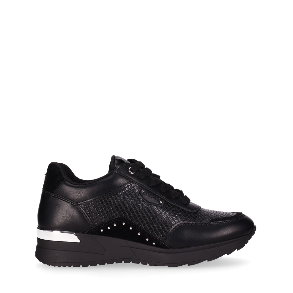 Sneaker con textura y detalles metálicos. Este sneaker presenta un diseño texturizado con acentos metálicos. Combina una suela plana y estabilizador metalizado en el talón con un cierre acordonado y remaches metalizados siguiendo la tendencia, será tu opción más confy para cualquier look