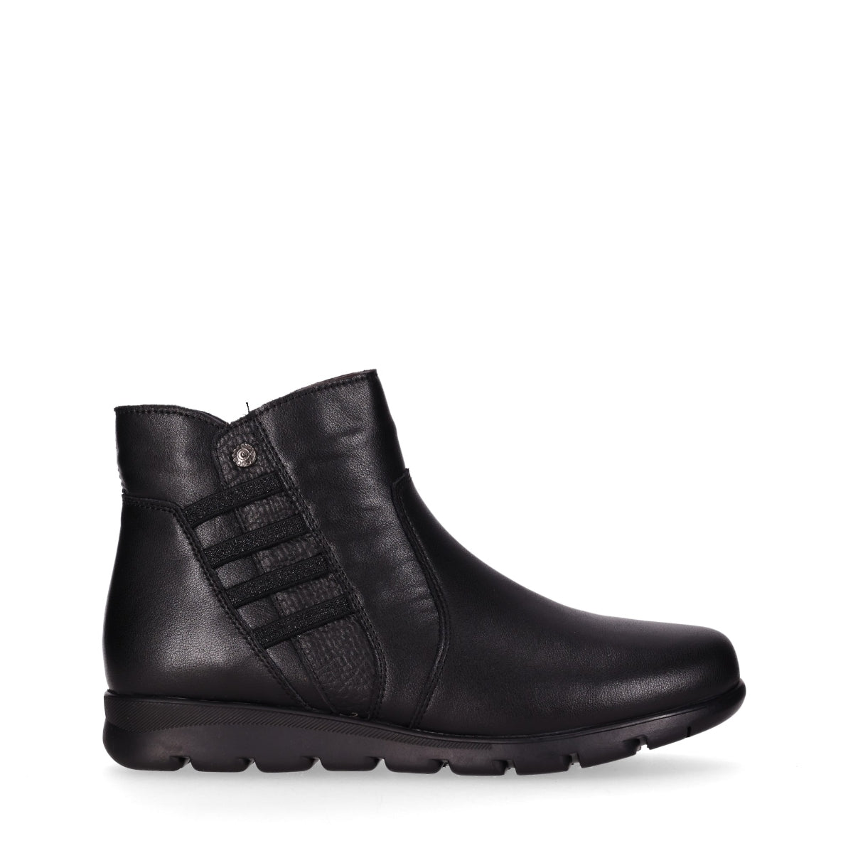 Botín de piel con detalles decorativos: Botín de piel con superficie texturizada y suela plana que ofrece comodidad en cada paso. El diseño incluye costuras decorativas, tres tiras horizontales y un pequeño detalle metálico que aporta carácter. Diseño único para un estilo que habla por ti.
