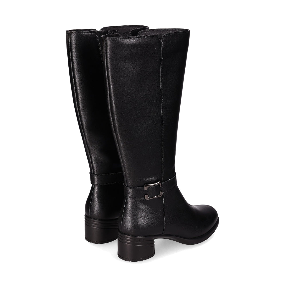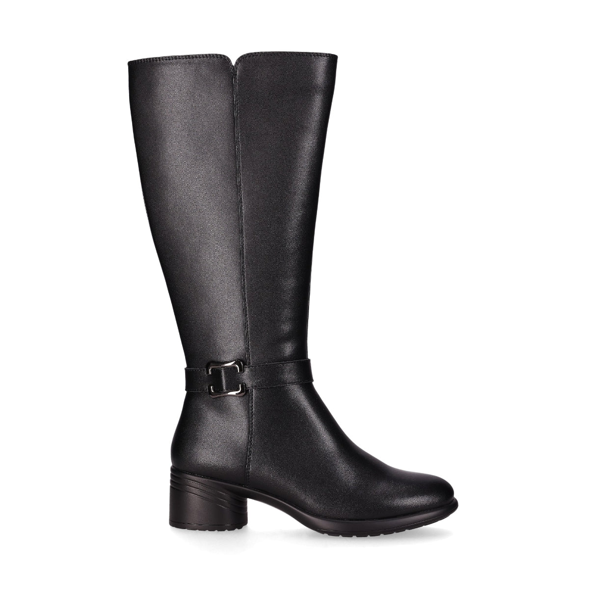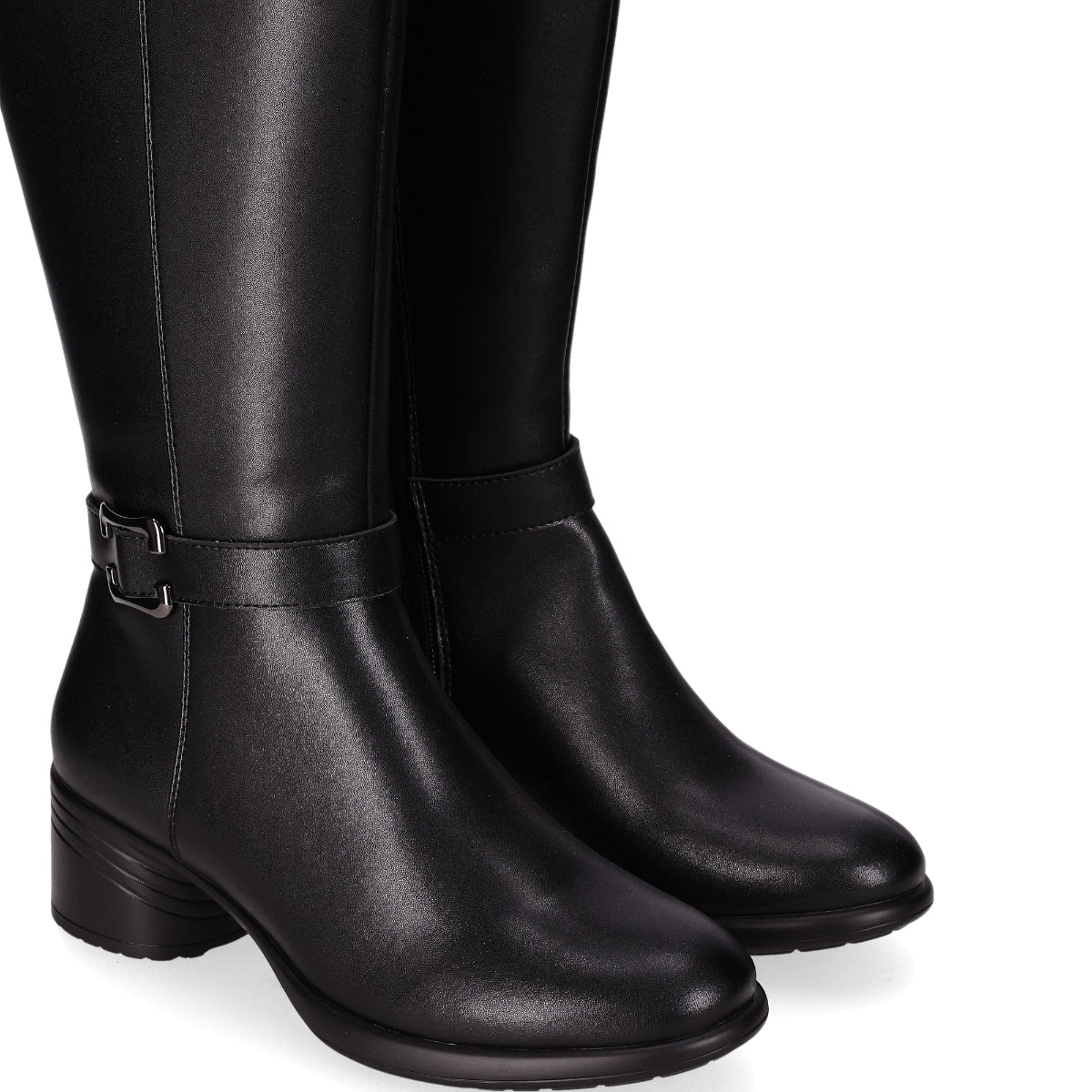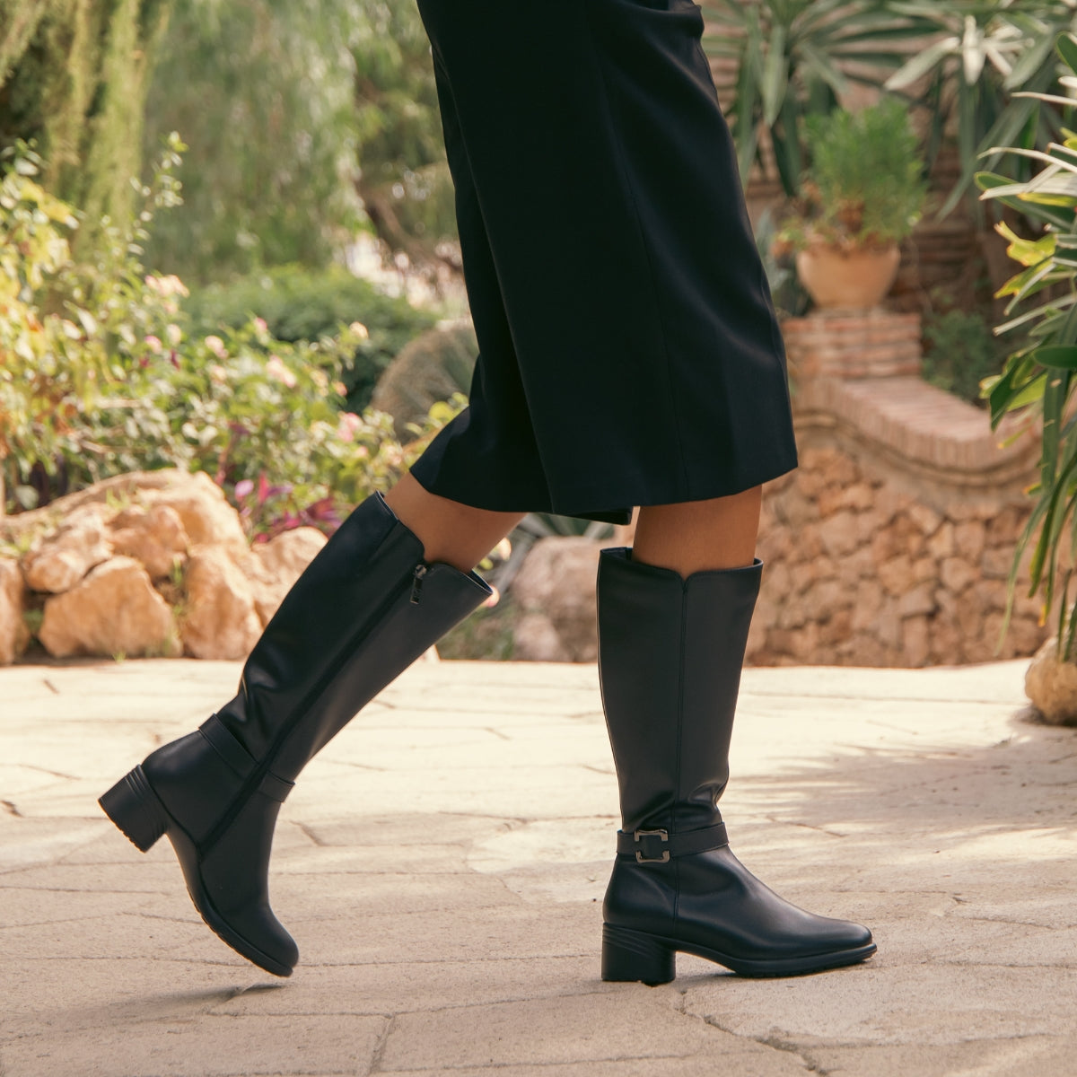 Bota alta de cuero con tacón medio: Este elegante botín de cuero pulido combina un diseño minimalista con detalles en forma de pulsera con hebilla que matiene el estilo sofisticado. La costura vertical añade un toque único, mientras que la suela texturizada proporciona tracción y estabilidad. ¡Perfecto para dar el toque classy a cualquier look!