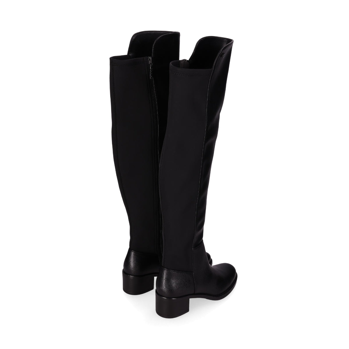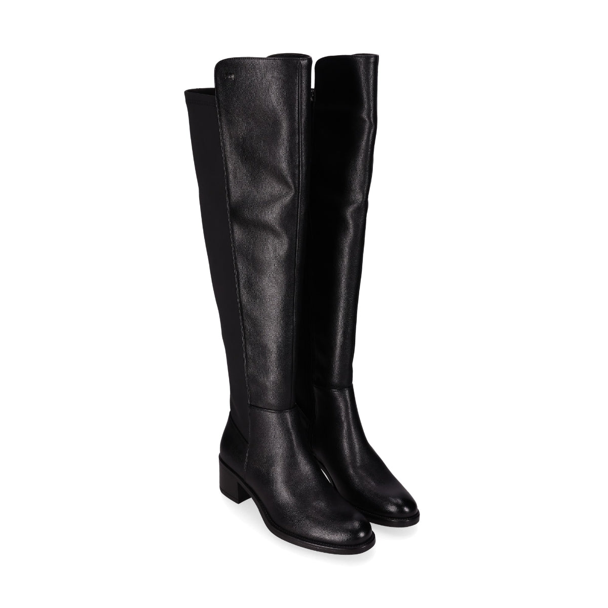 Botas de tacón medio con cremallera lateral. Su caña asimétrica alta hasta la rodilla, presenta un elegante acabado en piel vegana suave. Con cierre de cremallera lateral y su diseño sofisticado las hace perfectas para ocasiones casuales y looks formales. ¡Combina elegancia y confort en cada paso!