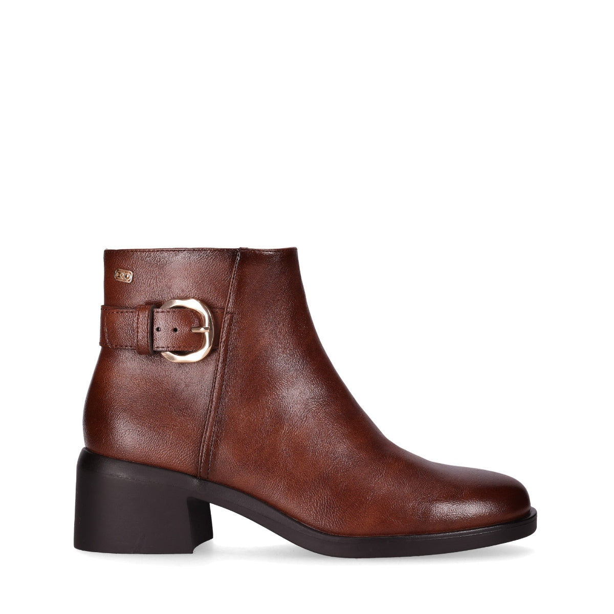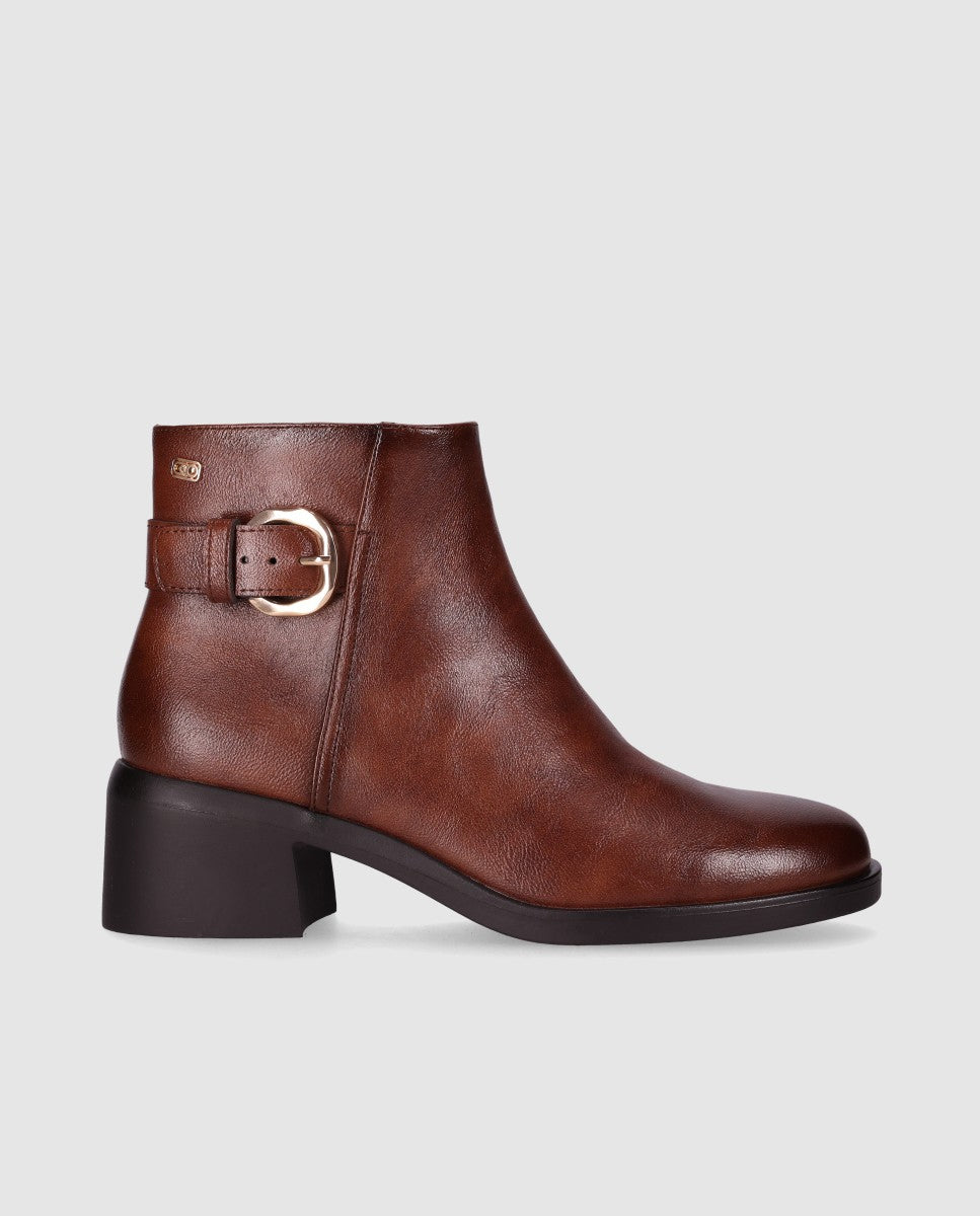 Botines de caña baja con hebilla decorativa. Estos elegantes botines en piel vegana presentan un diseño moderno con un tacón bajo y grueso para mayor comodidad. La correa decorativa con hebilla en el lateral añade un toque de estilo. ¡Perfectos para darle un toque chic a cualquier look!