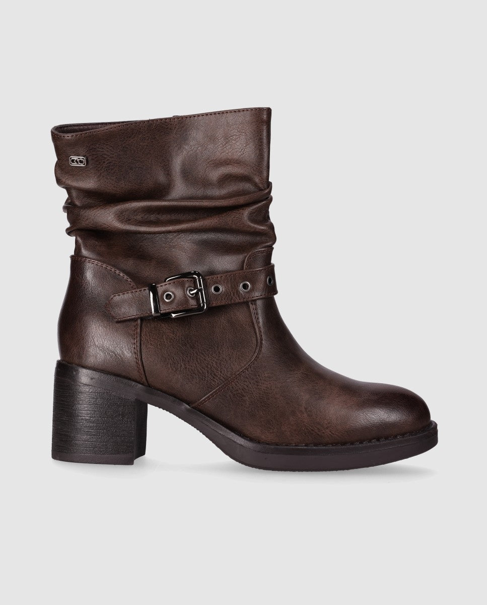 Botín de tacón hebilla decorativa. De caña media, presenta un diseño holgado con rugosidades en la piel y una hebilla decorativa en el tobillo. El tacón es de bloque ancho y proporciona una base robusta y cómoda. Perfecto para un look de día a día.